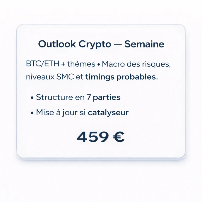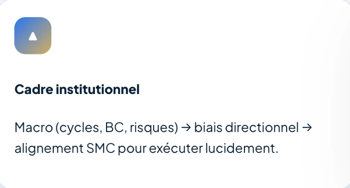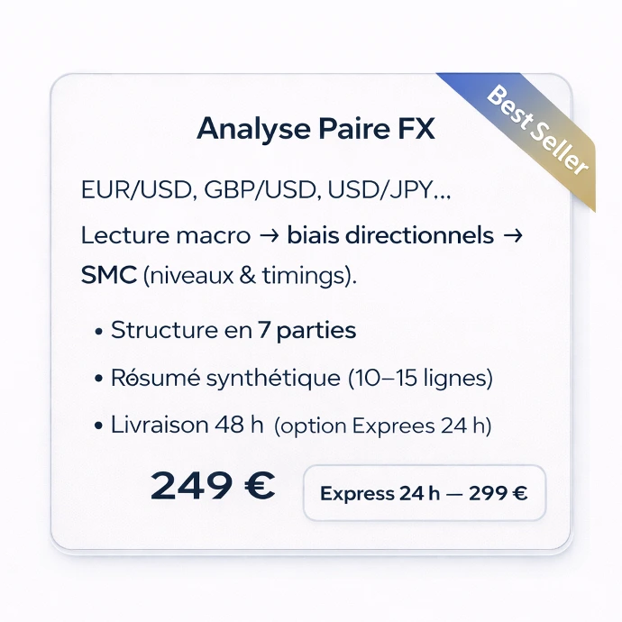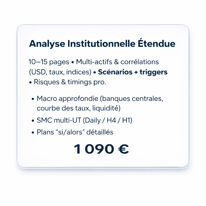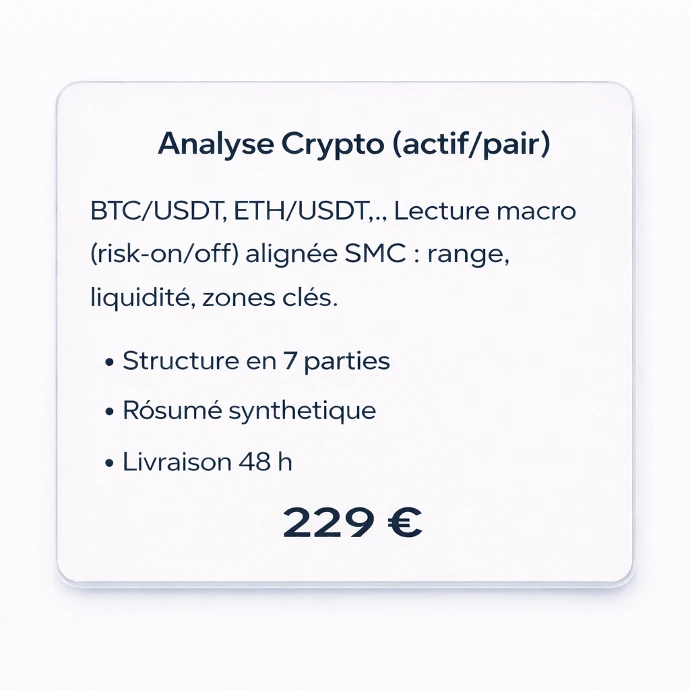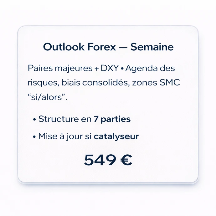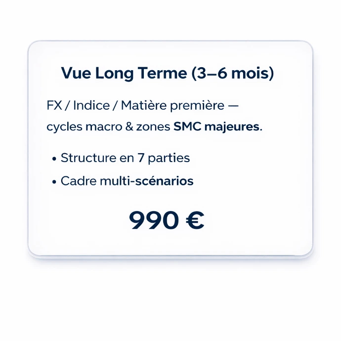 Chaque rapport relie les catalyseurs macroéconomiques aux biais directionnels dominants, puis les traduit selon une lecture Smart Money Concepts. Vous recevez un cadre complet : contexte, zones de prix, scénarios, et timings opérationnels . Objectif : clarifier vos décisions.
